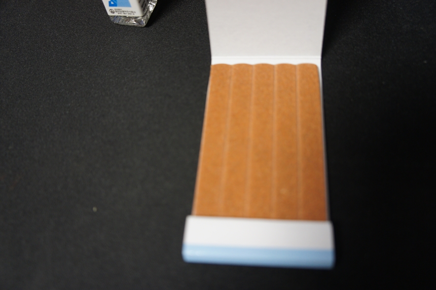 금강사판입니다. 종이성냥처럼 되어 있는데, 하나씩 뜯어서 사마귀를 갈아내는 데 사용합니다. 앞쪽은 갈색, 뒷쪽은 흰색이랑 갈색 부분만 사용하는 줄 알았는데, 흰색 뒷면도 사포더라구요. 그래서 앞뒤로 사용합니다.