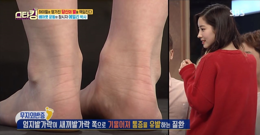 2016년 SBS 인기 예능프로그램인 스타킹에 출연하여, 당시 베어풋 운동의 창시자로 알려진 에밀리 박사에게 발 상태를 공개했는데요. 평발일 뿐만 아니라, 무지외반증도 있다는 진단을 받았습니다. 무지외반증은 엄지발가락이 새끼발가락 쪽으로 기울어져 통증을 유발하기 질환입니다.
